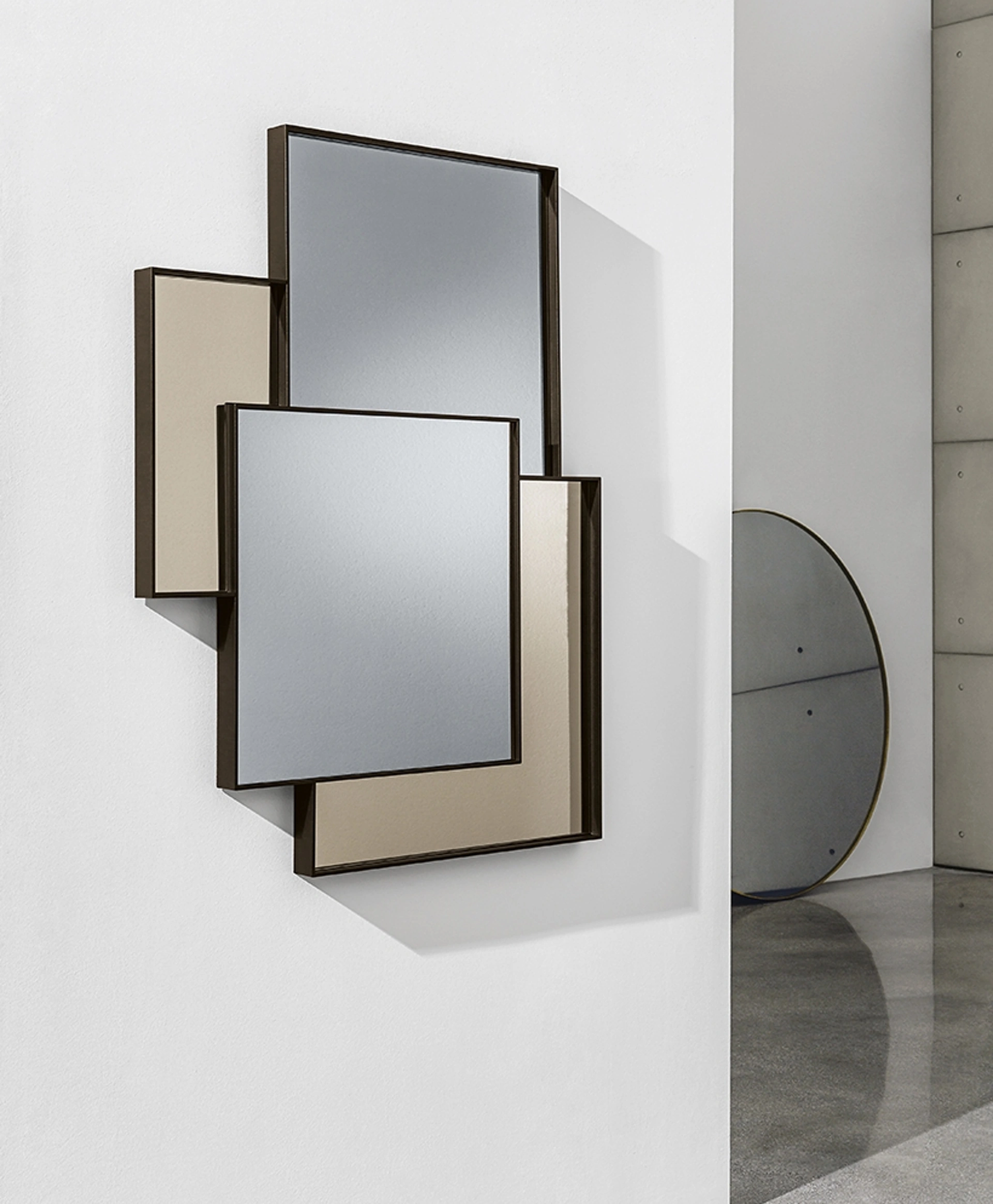 Il Combi Specchio di Sovet si distingue come un raffinato componente d'arredo, progettato per infondere dinamismo e profondità visiva in ogni ambiente. La sua concezione strutturale si basa su un telaio in alluminio, disponibile nelle eleganti finiture laccate caffè, brunito o nero, che abilmente articola e connette sezioni specchianti con diverse gradazioni cromatiche. Questa composizione non solo genera un suggestivo effetto astratto attraverso le molteplici riflessioni, ma evoca anche la precisione e l'armonia di un mosaico contemporaneo. La peculiare interazione tra luce e superficie trasforma la semplice funzione riflettente in un elemento di design capace di conferire un significato estetico profondo allo spazio circostante. La selezione accurata dei materiali, come l'alluminio e le lastre di specchio di alta qualità, ne garantisce la durabilità e l'impatto visivo. La meticolosa progettazione e l'impiego di materiali di alta qualità assicurano un'integrazione stilistica impeccabile e una durata nel tempo, caratteristica distintiva dei prodotti di design di alto livello.