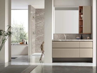 Il mobile bagno Divo 05 è disponibile in finiture laccate, legno o laminato, tutti materiali selezionati per la loro eccellente resistenza all'umidità tipica dell'ambiente bagno. Puoi visionare i campioni nella nostra materioteca per scegliere la finitura più adatta alle tue esigenze.