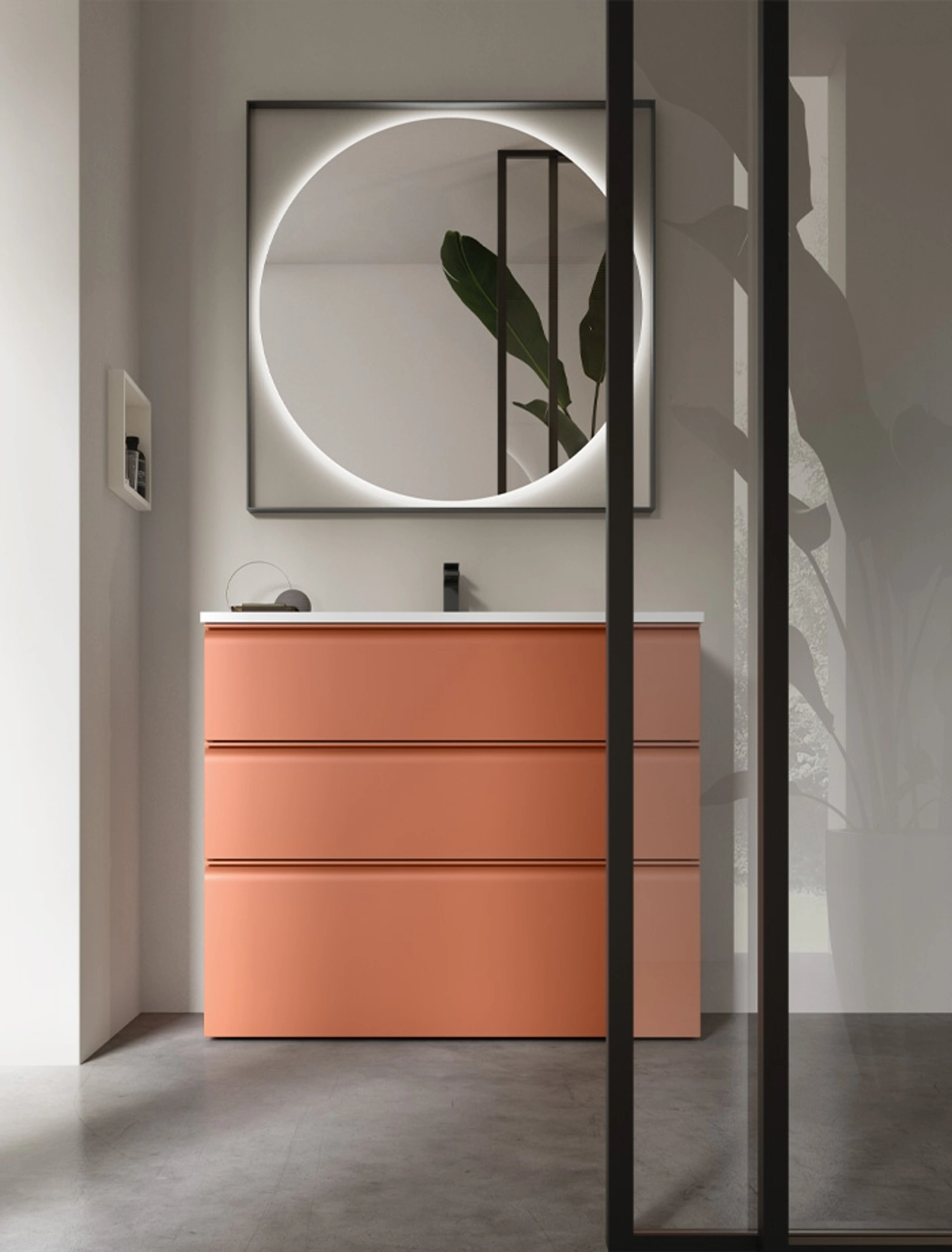| Materiale: | Laccati opachi (Bianco, Taupe, Grafite, Nero, Colori Metal e Lux), Top con lavabo integrato Venus in termoformato. |