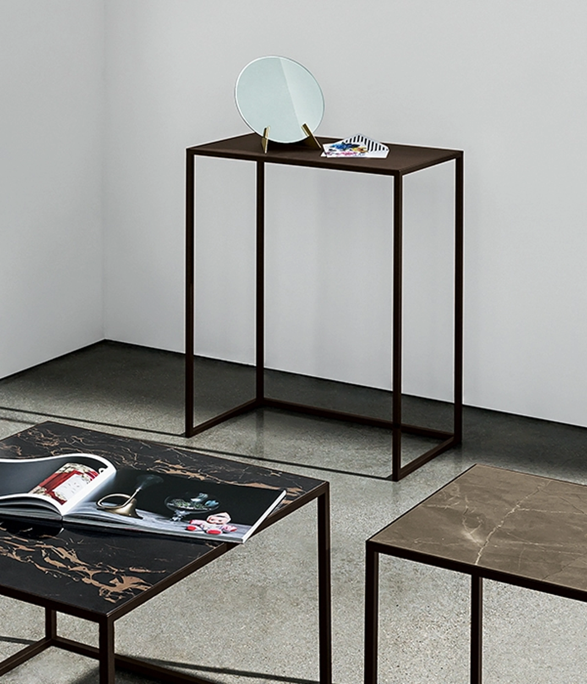 La Consolle Quadro, firmata Sovet, si distingue come soluzione d'arredo altamente versatile per ambienti moderni. Caratterizzata da una robusta struttura metallica, offre un'ampia scelta per il piano d'appoggio: dal raffinato vetro (nelle varianti specchio o specchio acidato) alle innovative finiture in Materia o ceramica. Questa modularità di materiali e colorazioni consente un'elevata personalizzazione, adattandosi perfettamente a ogni esigenza stilistica e funzionale. La durabilità e l'estetica sono garantite dalla selezione accurata dei materiali e dalle tecniche costruttive avanzate, assicurando un complemento d'arredo di lunga durata e impatto visivo.