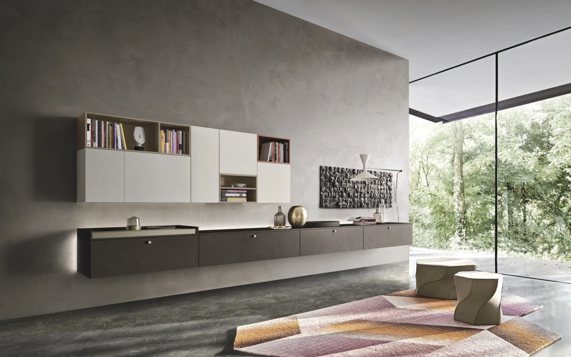 | Materiale: | Laccato opaco (es. Terranova, Magnolia), Impiallacciato (es. Rovere Avana, Noce Canaletto), Materico (es. Sketch Roccia), Metallo, Vetro fumé trasparente |