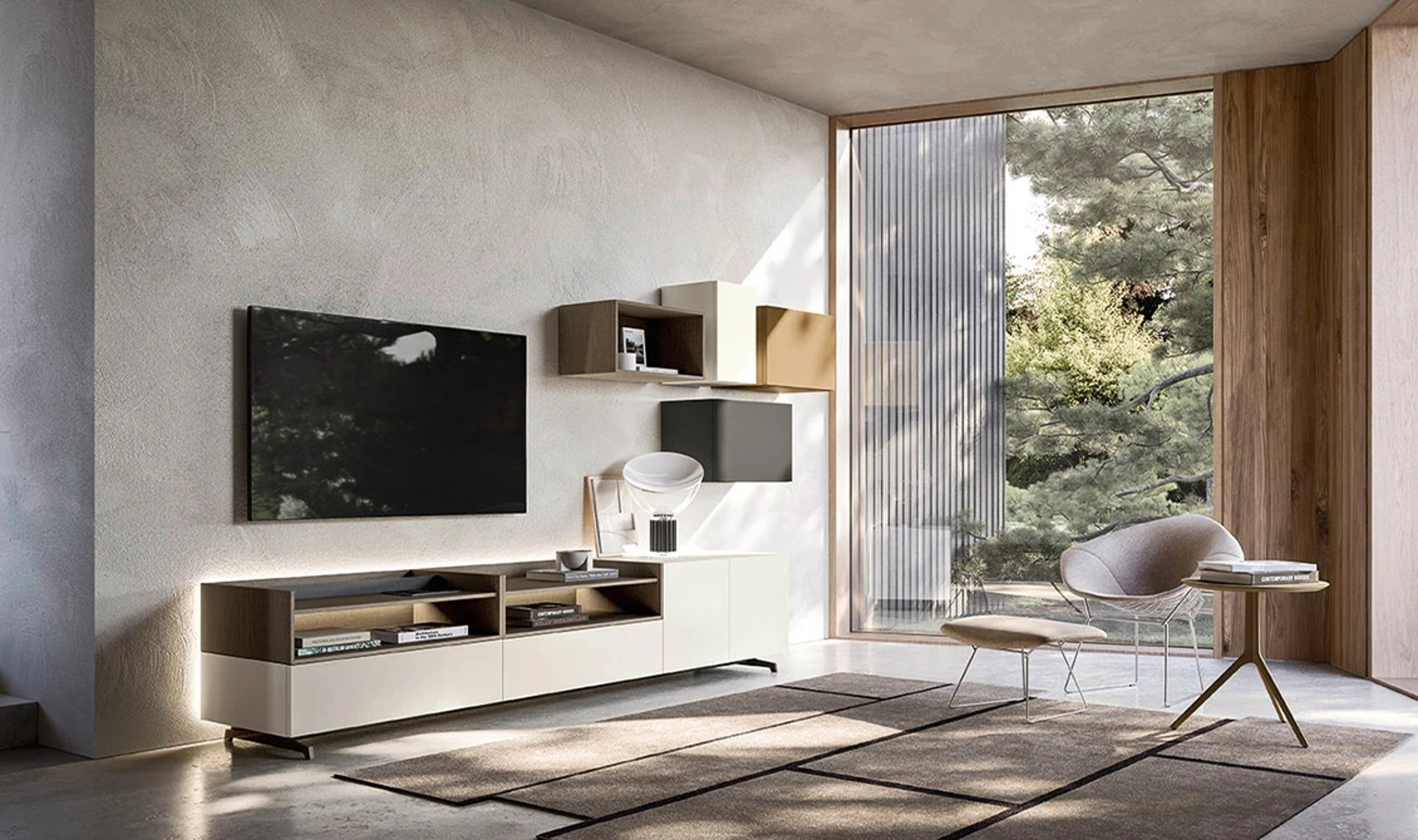 Il sistema d'arredo Parete Attrezzata Lampo 033 di Sangiacomo è stato progettato per ottimizzare gli spazi living con un'estetica all'avanguardia. Le mensole, realizzate in Legno di rovere caramello con uno spessore di 6 cm, non solo definiscono un design robusto ma aggiungono un tocco di calore naturale. La base sospesa, anch'essa in Legno di rovere caramello, integra una soluzione intelligente: un supporto per televisore girevole, completo di un sistema di canalizzazione interna per i cavi, che mantiene l'ambiente ordinato e funzionale. Questa configurazione si distingue per la sua componibilità intrinseca, offrendo la massima libertà di personalizzazione per adattarsi a specifiche esigenze progettuali e dimensionali. L'architettura modulare avanzata e le opzioni di personalizzazione consentono di creare soluzioni su misura, integrandosi perfettamente in ogni contesto abitativo moderno.